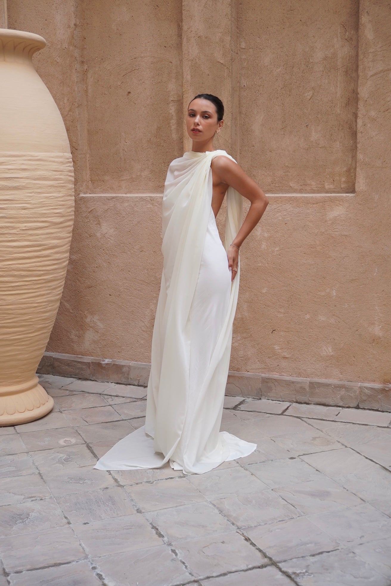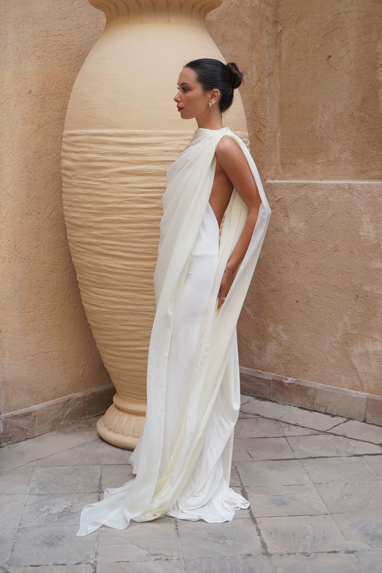 On Isabella, who is 164 cm, the cape falls generously and drapes to the floor.